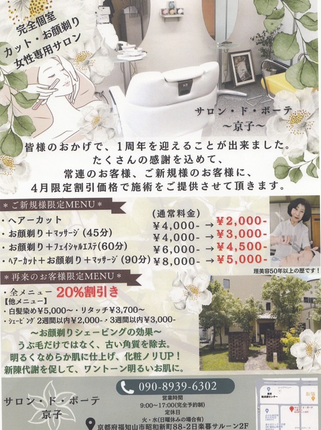 サロン・ド・ボーテ 〜京子〜 京都府北部で唯一の女性の為のお顔剃り専門店です。 ☆女性の為の空間なので、リラックスして安心して来店できる ☆理容師歴50年余りの実関があります。 ☆女性スタッフ1名。 ☆丁寧な施術、柔らかい当たり ☆完全予約制